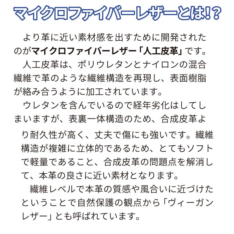 マイクロファイバーレザーは皮革よりも耐久性が高く、丈夫で傷にも強い素材です。