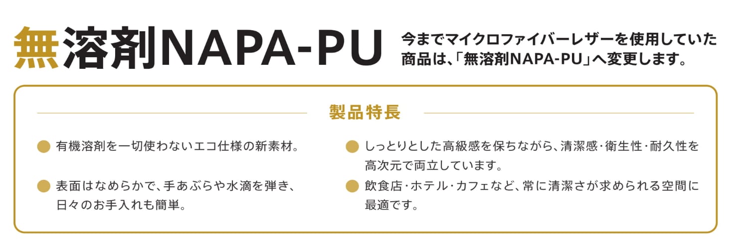 今までマイクロファイバーレザーを使用していた商品は、「無溶剤NAPA-PU」へ変更します。